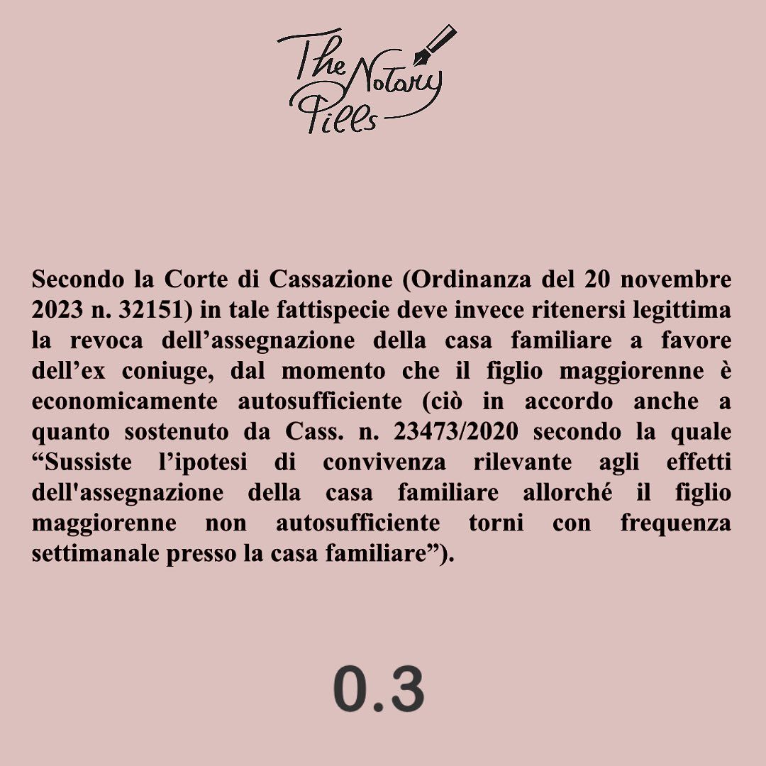 Se il figlio raggiunge l’autosufficienza economica, l’ex coniuge ha diritto all’assegnazione della casa familiare? No, secondo la Cassazione (Ordinanza del 20 novembre 2023 n. 32151). L’assegnazione della casa familiare ai sensi dell’art. 337 sexies c.c. viene effettuata tenendo prioritariamente conto dell’interesse dei figli minorenni e dei figli maggiorenni non autosufficienti economicamente a permanere nell’ambiente domestico in cui sono cresciuti, per garantire il mantenimento delle loro consuetudini di vita e delle relazioni sociali che in tale ambiente si sono radicate. Nel caso sottoposto al vaglio della Suprema Corte di Cassazione una donna chiede in giudizio il permanere del suo diritto all’assegnazione della casa familiare in considerazione del fatto che il figlio, seppur autosufficiente economicamente, vi faceva rientro con frequenza giornaliera dopo il lavoro. Secondo la Cassazione in tale fattispecie deve invece ritenersi legittima la revoca dell’assegnazione della casa familiare a favore dell’ex coniuge, dal momento che il figlio maggiorenne è economicamente autosufficiente (ciò in accordo anche a quanto sostenuto da Cass. n. 23473/2020 secondo la quale “Sussiste l’ipotesi di convivenza rilevante agli effetti dell’assegnazione della casa familiare allorché il figlio maggiorenne non autosufficiente torni con frequenza settimanale presso la casa familiare”).
