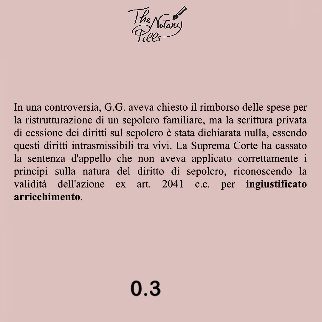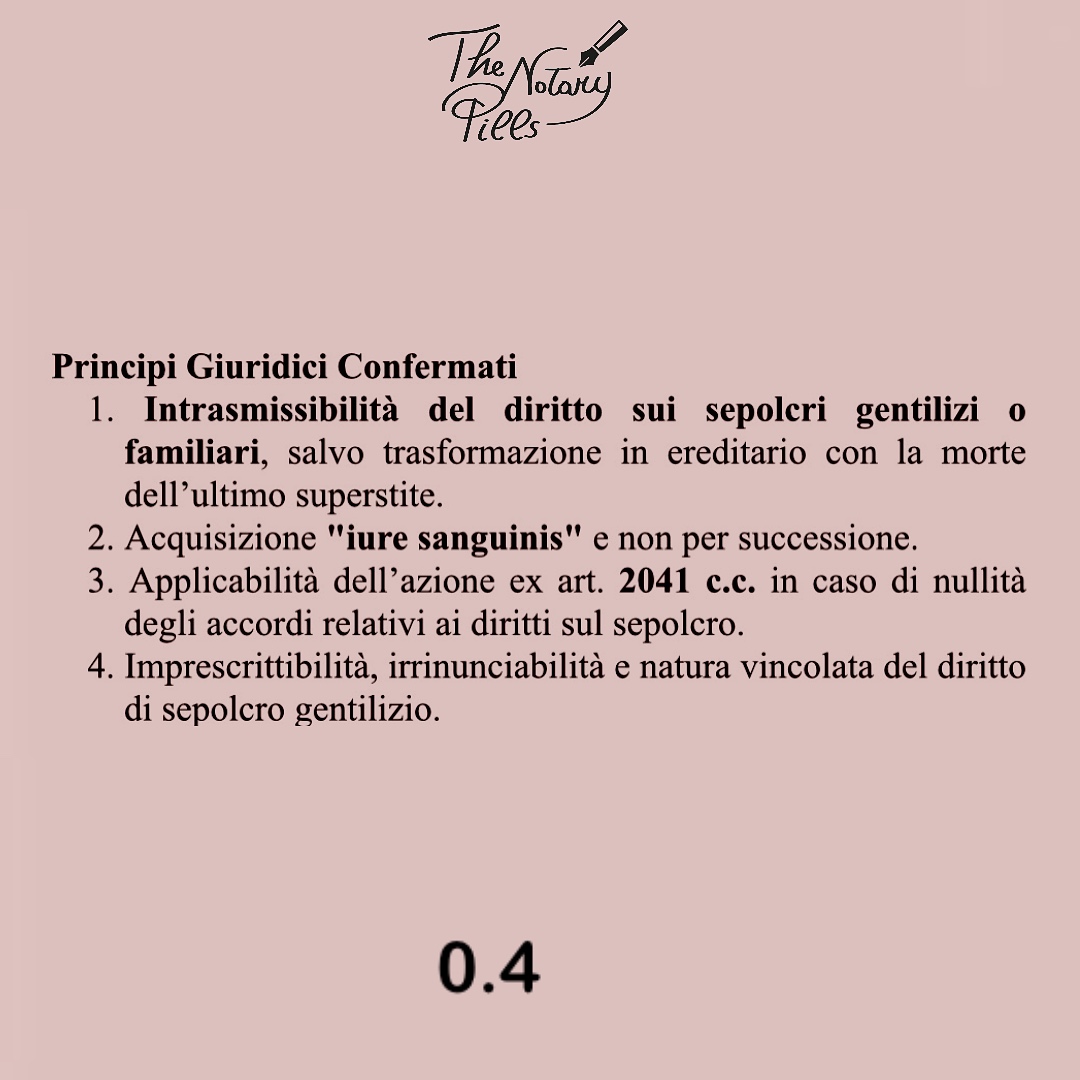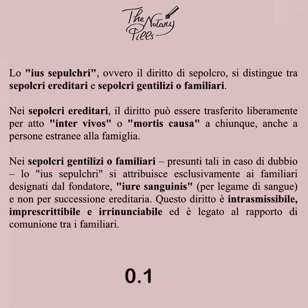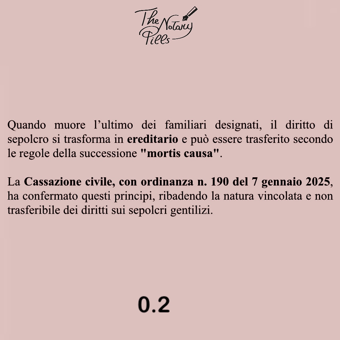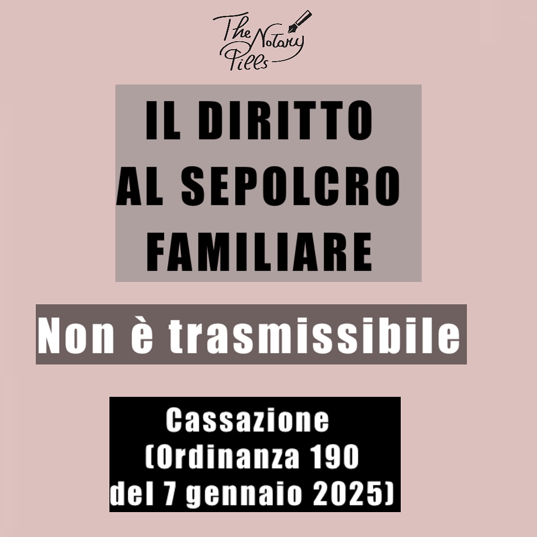 Lo “ius sepulchri” nei sepolcri gentilizi o familiari è intrasmissibile per atto “inter vivos” o “mortis causa”, salvo che il sepolcro diventi ereditario alla morte dell’ultimo superstite dei familiari designati. In questo caso, il diritto si trasferisce secondo le regole ordinarie della successione. La Cassazione civile, ordinanza del 7 gennaio 2025 n. 190/2025, ha ribadito che tale diritto si acquisisce “iure sanguinis” e non per successione, è imprescrittibile, irrinunciabile e non trasferibile.