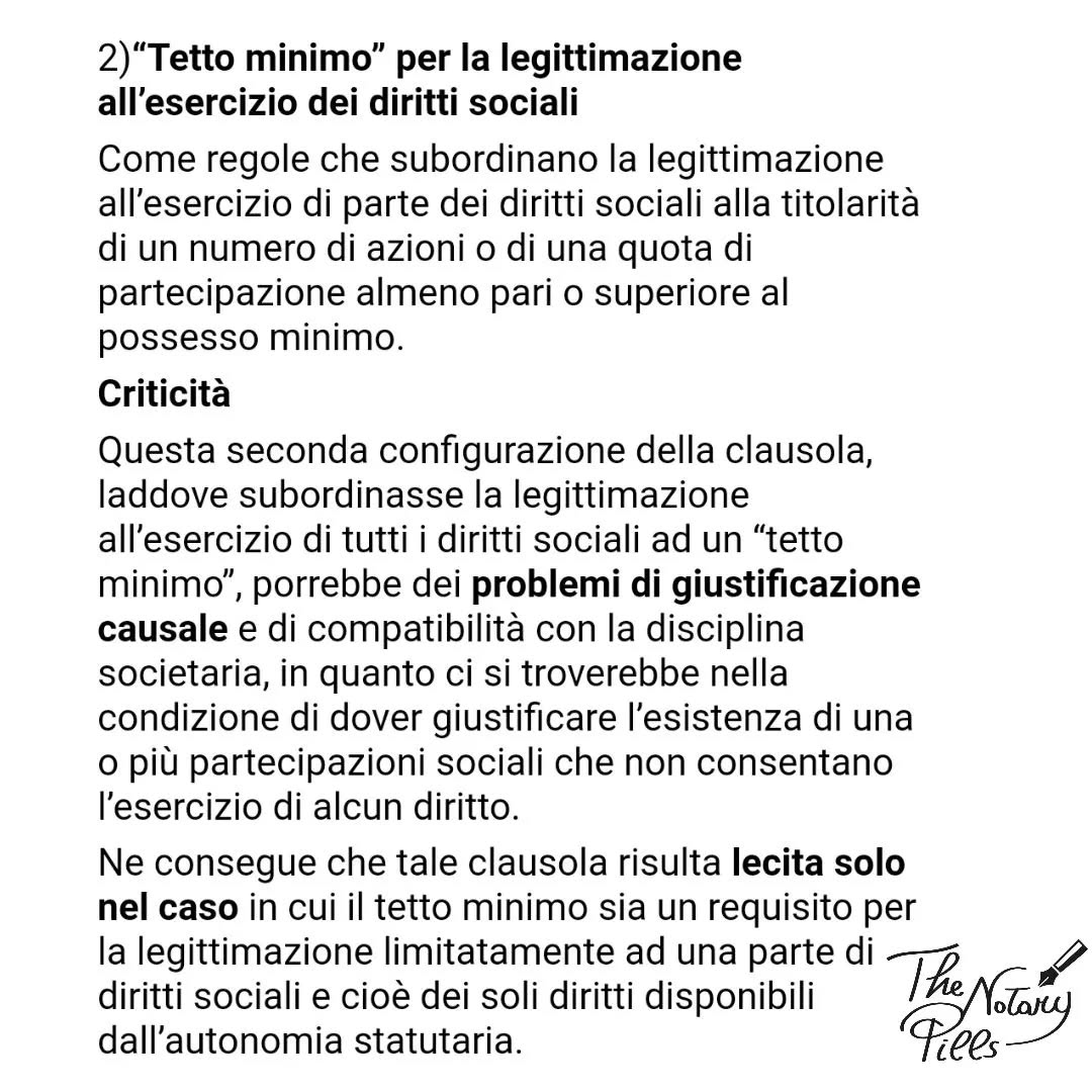 2)“Tetto minimo” per la legittimazione all’esercizio dei diritti sociali: Come regole che subordinano la legittimazione all’esercizio di parte dei diritti sociali alla titolarità di un numero di azioni o di una quota di partecipazione almeno pari o superiore al possesso minimo. Criticità: Questa seconda configurazione della clausola, laddove subordinasse la legittimazione all’esercizio di tutti i diritti sociali ad un “tetto minimo”, porrebbe dei problemi di giustificazione causale e di compatibilità con la disciplina societaria, in quanto ci si troverebbe nella condizione di dover giustificare l’esistenza di una o più partecipazioni sociali che non consentano l’esercizio di alcun diritto. Ne consegue che tale clausola risulta lecita solo nel caso in cui il tetto minimo sia un requisito per la legittimazione limitatamente ad una parte di diritti sociali e cioè dei soli diritti disponibili dall’autonomia statutaria. Quorum: In questo caso la relativa delibera di modifica dello statuto sociale che introduca la clausola deve essere adottata, oltre che con le maggioranze richieste dalla legge e dallo statuto, anche con il consenso dei soci che siano titolari di un numero di azioni o di una partecipazione inferiori al possesso minimo richiesto dalla nuova clausola statutaria.