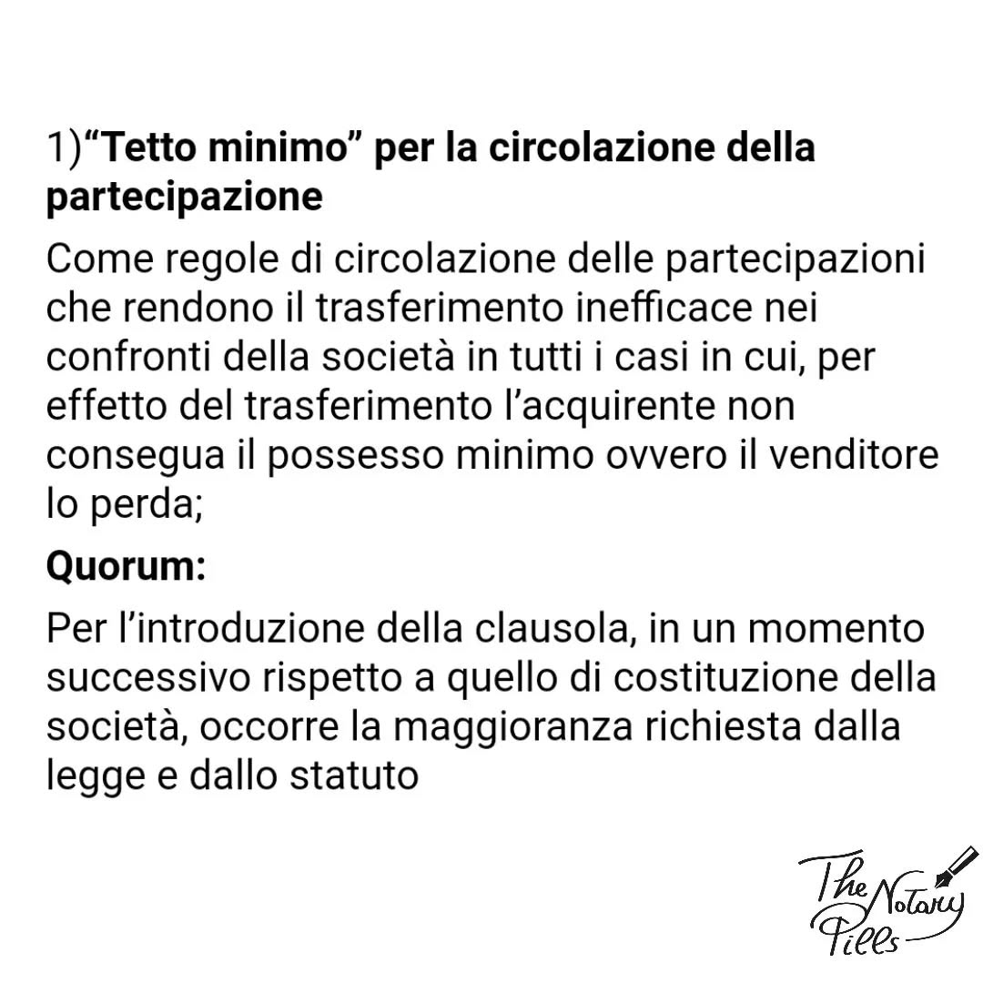 1)“Tetto minimo” per la circolazione della partecipazione: Come regole di circolazione delle partecipazioni che rendono il trasferimento inefficace nei confronti della società in tutti i casi in cui, per effetto del trasferimento l’acquirente non consegua il possesso minimo ovvero il venditore lo perda; Quorum: per l’introduzione della clausola, in un momento successivo rispetto a quello di costituzione della società, occorre la maggioranza richiesta dalla legge e dallo statuto.