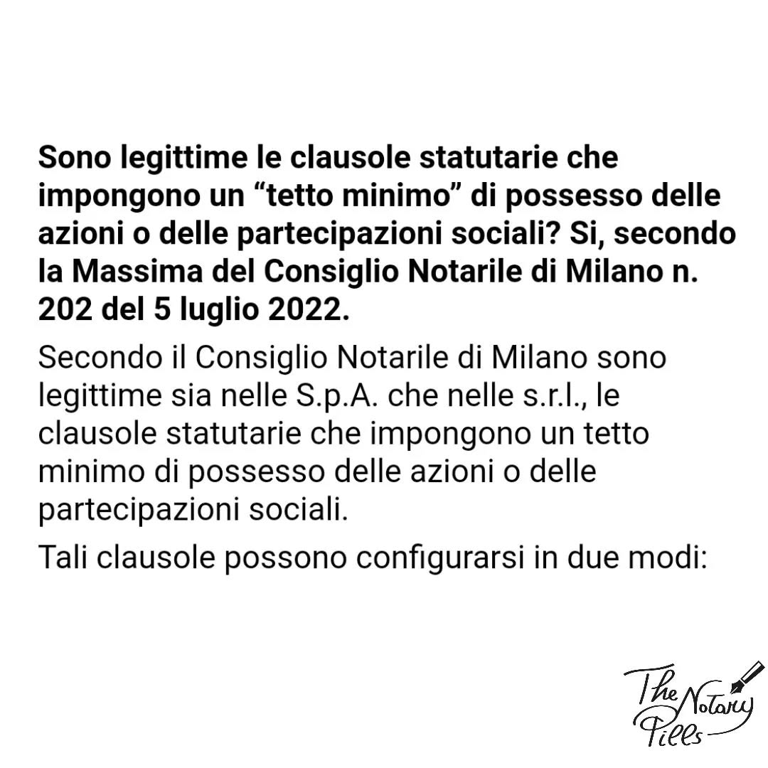 Secondo il Consiglio Notarile di Milano (Massima n.202) sono legittime sia nelle S.p.A. che nelle s.r.l., le clausole statutarie che impongono un tetto minimo di possesso delle azioni o delle partecipazioni sociali. Tali clausole possono configurarsi in due modi: